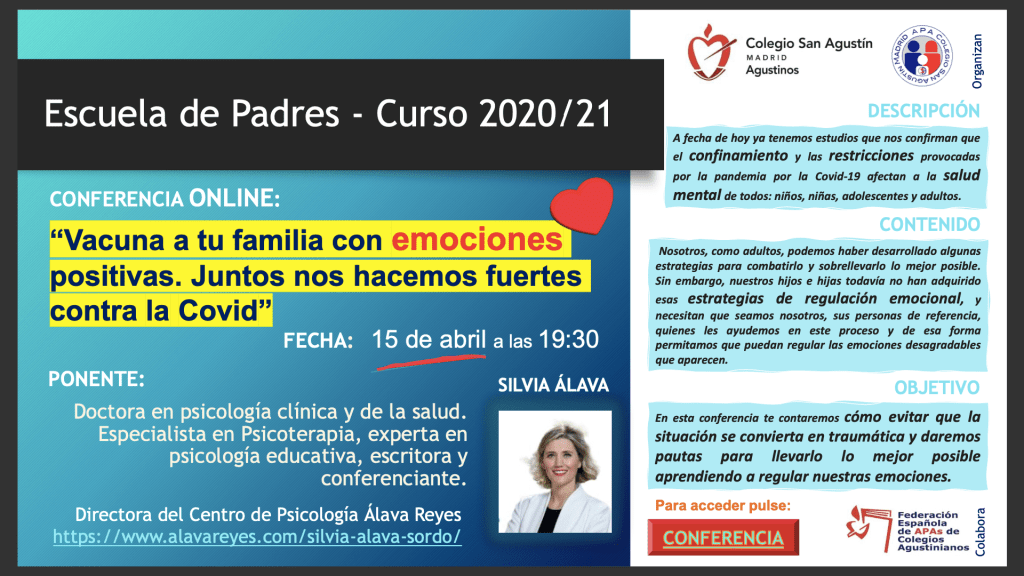Actividades Escuela de Padres. Conferencia Online. 15 de abril 19h30′ Por ricardo78blog en 7 07+01:00 abril 07+01:00 2021 • ( Deja un comentario ) cartel_conferencia-gestionando-emociones-silvia-alava-15-abril-2021-vf-2 Compartir: Haz clic para enviar un enlace por correo electrónico a un amigo (Se abre en una ventana nueva) Correo electrónico Haz clic para imprimir (Se abre en una ventana nueva) Imprimir Haz clic para compartir en WhatsApp (Se abre en una ventana nueva) WhatsApp Haz clic para compartir en X (Se abre en una ventana nueva) X Me gusta Cargando... Relacionado Categorías:Actividades, APA, Escuela de Padres, Noticias