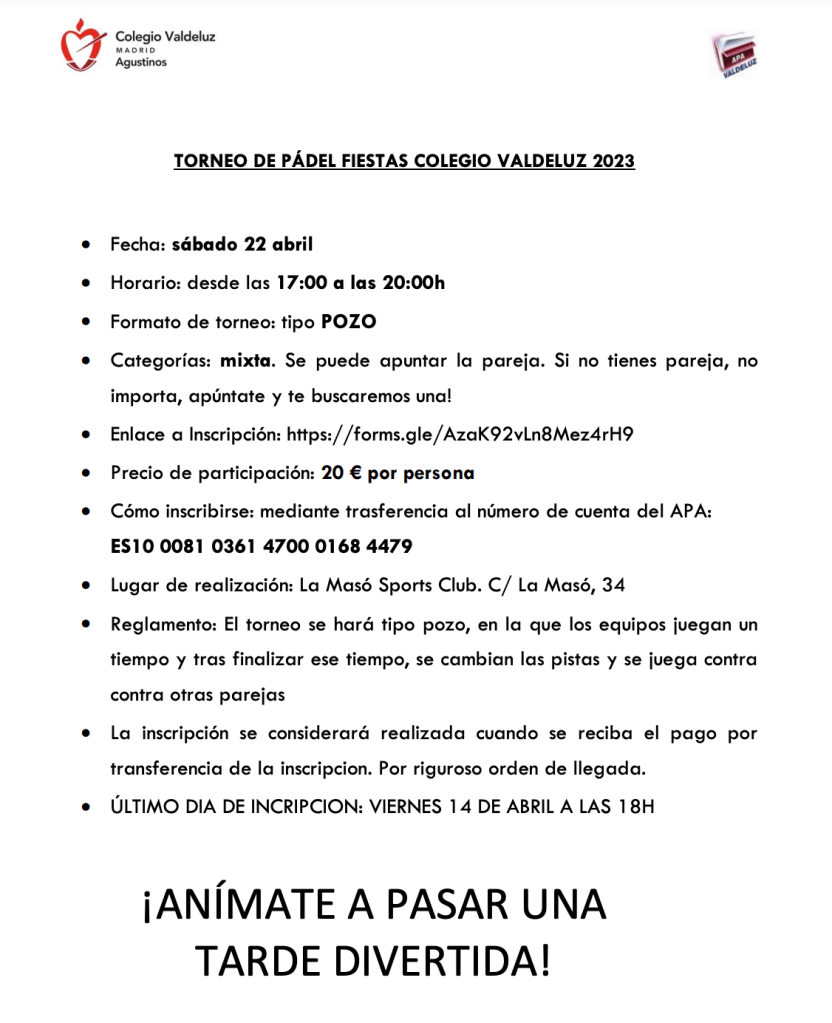 Actividades culturales TORNEO DE PÁDEL FIESTAS COLEGIO VALDELUZ 2023 Por ricardo78blog en 11 11+01:00 abril 11+01:00 2023 • ( Deja un comentario ) torneo-de-padel_modificadoDescarga Compartir: Haz clic para enviar un enlace por correo electrónico a un amigo (Se abre en una ventana nueva) Correo electrónico Haz clic para imprimir (Se abre en una ventana nueva) Imprimir Haz clic para compartir en WhatsApp (Se abre en una ventana nueva) WhatsApp Haz clic para compartir en X (Se abre en una ventana nueva) X Me gusta Cargando... Relacionado Categorías:Actividades culturales, Fiestas